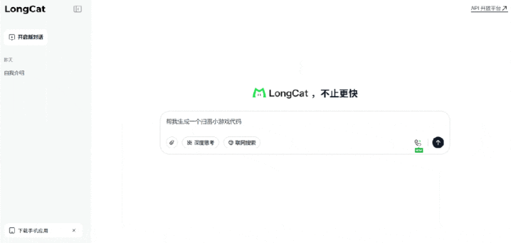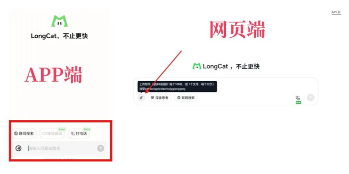 打开LongCat APP,从首页可以看到,它目前支持文字/语音两种输入方式,并能进行语音通话(视频通话功能正在跑步入场中),Web端还支持上传图片和文件。