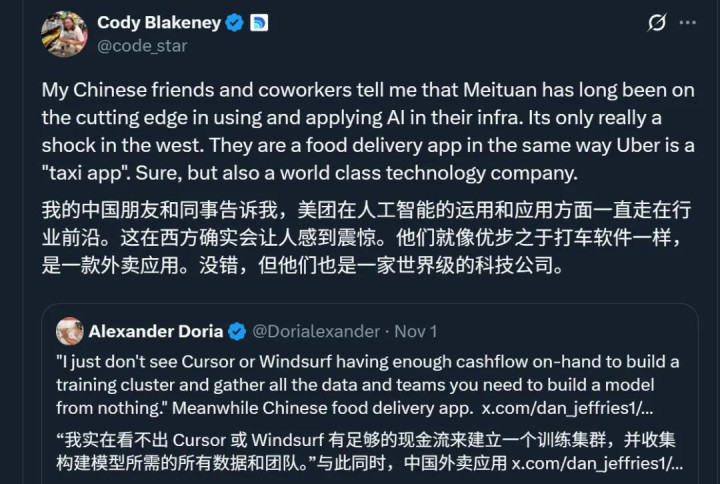 以及有意思的是,美团发布这一成果时恰逢“Cursor‘自研’模型套壳国产开源”的八卦发酵之际,因此美团AI实力被低估的看法正在受到热议。(网友os:看看人家外卖公司,对比过于惨烈~)